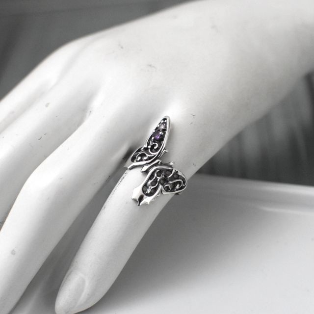 透かし彫りで彫刻されたアゲハ蝶が指元を取り巻くアイテムです。