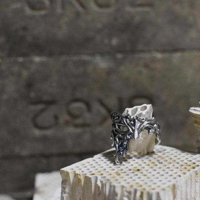 仮面とアゲハ蝶をモチーフにデザインされたシルバーリング。