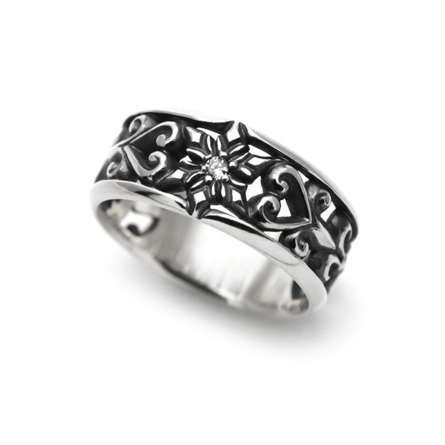 リング側面は透かし彫りで施された繊細な文様が取り巻きます。